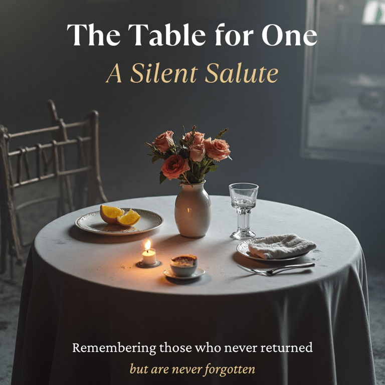 The chair leans forward slightly, as though waiting for someone to return. This table is not a forgotten decoration; it is a sacred reminder of those who never came back—the Prisoners of War, missing yet remembered, absent yet eternal in spirit.