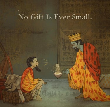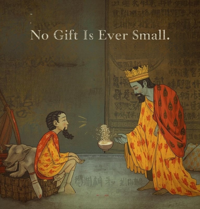 In a Jataka tale, a humble offering of a small portion of gruel becomes the cause of the Bodhisattva’s rebirth as a great king. The story reminds us that generosity is measured not by quantity, but by sincerity. When given with a pure heart, even the smallest act of kindness becomes the seed of lasting prosperity.